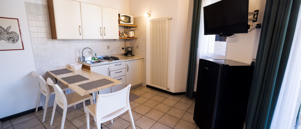 Large open space studio of 40 square meters, with terrace overlooking the lake, double bed, bathroom, kitchen, sofa ... complete with linen, towels and dishes.
